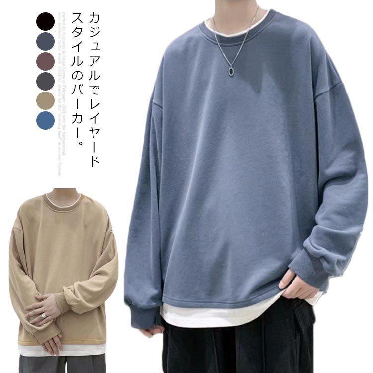 パーカー メンズ トップス プルオーバー 長袖 ラウンドネック レイヤード風 ゆったり ゆるパーカー ドロップショルダー フェイクレイヤード