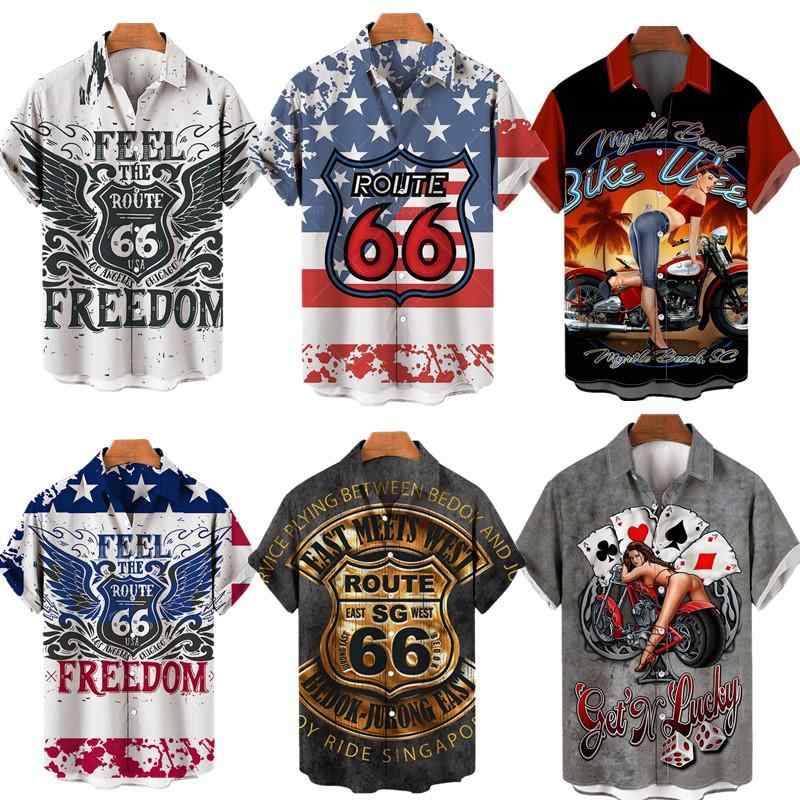 シャツ メンズ アメリカ ルート66 3Dデジタルプリント柄 半袖 開襟 ポリエステル 吸湿速乾 ノーアイロン ストレッチ 高耐久 旅行 ビーチ カジュアル トップス リゾート