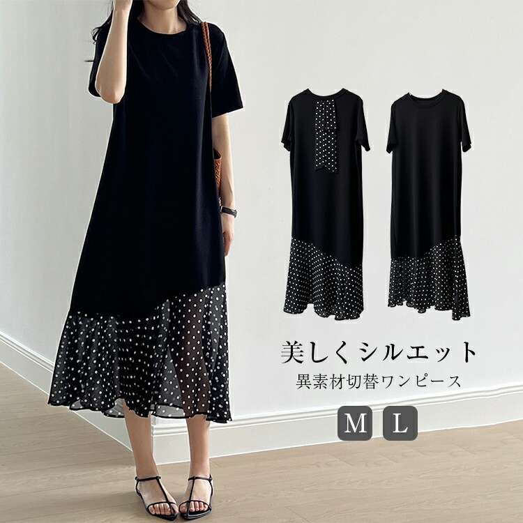 ワンピース 切り替えワンピース レディース 夏 半袖 クルーネック 異素材 切替ワンピース ロングワンピース マキシワンピース ドット柄 快適 きれいめ おしゃれ カジュアル 通 ゆったり