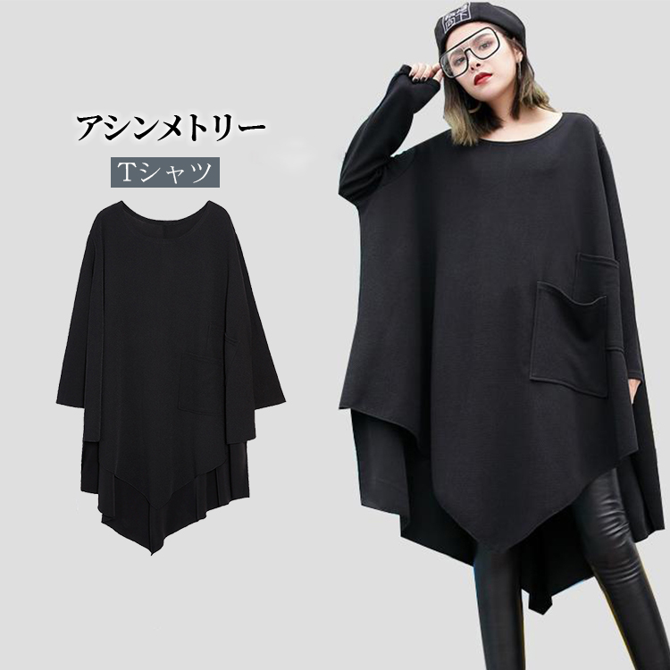 ロングワンピース 長袖 レディース 春 秋 冬 裾変形デザイン アシンメトリーTシャツ トップス Uネック カットソー ロングTシャツ 変形 モード 大サイズ きれいめ 無地 ゆったり