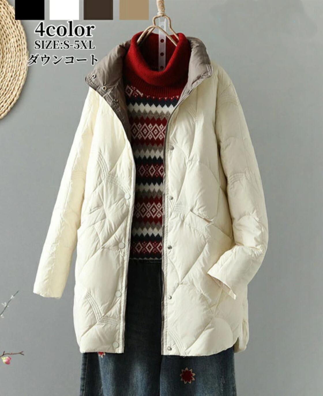 ダウンコート レディース ダウンジャケット ミドル丈コート 黒 ベージュ スプリングコート キルティングコート 長袖 アウター 大きいサイズ 防寒着 シンプル 着痩せ 冬服 軽量 カジュアル 通 秋服
