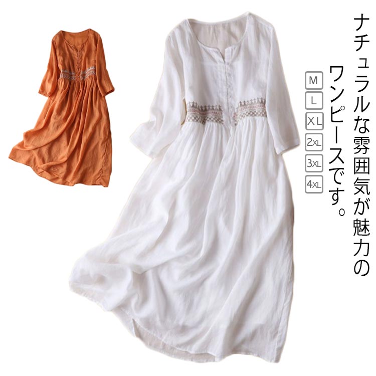 きれいめ 涼しい 9分袖 刺繡 フレアワンピース 民族風 レディース ワンピース 綿 ナチュラルワンピース 大きいサイズ 体型カバー ゆったり 軽い 通勤 春夏 森ガール