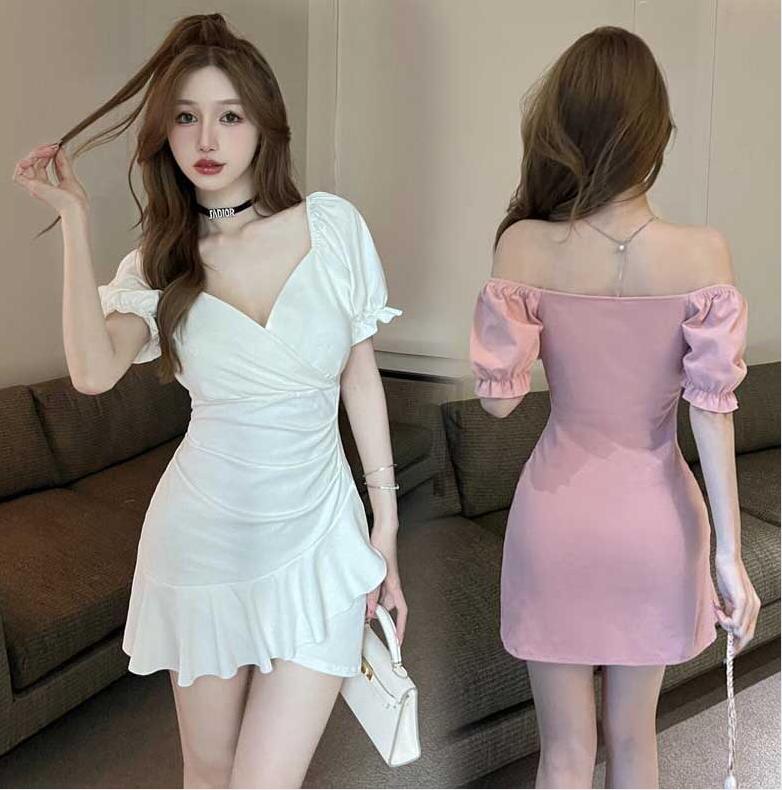 半袖 ミニワンピース レディース フリルスカート ワンピース ミニ丈 Vネック 夏 サマー ショートワンピース デコルテ見せ ワンピ 大人 きれいめ シンプル ギャザー 上品 エレガ 薄手