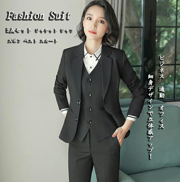 おしゃれ 5点セット ジャケット ズボン スカート ベスト シャツ 2type レディーススーツ スーツセット 無地 かわいい エレガント 高級感 スリム セットアップ 大きサイズ 2色 上下セット