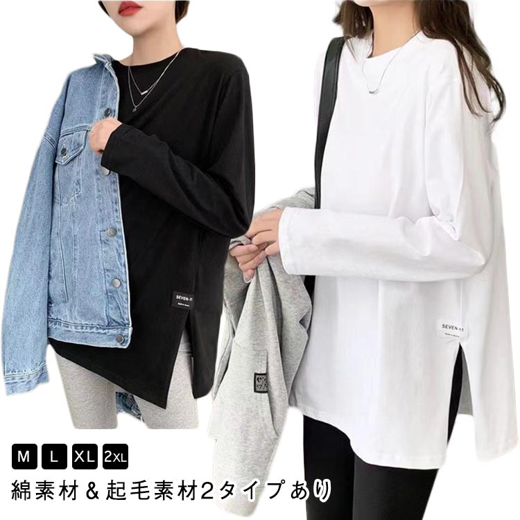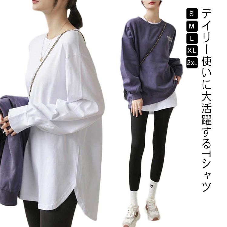 長袖 薄手と厚手2タイプ tシャツ レディース ロンT チュニック丈 クルーネック 重ね着 ゆったり 体型カバー ロングtシャツ トップス 大人可愛い レイヤード かわいい サイドスリット