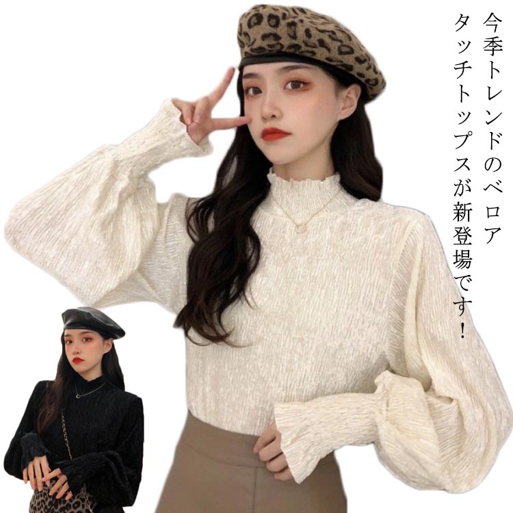 送料無料 シャツ 長袖 レディース ベロア トップス ハイネック ボリューム袖 きれいめ おしゃれ