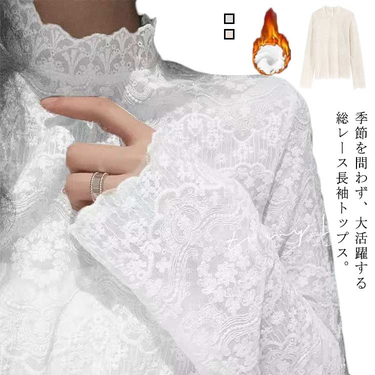 レーストップス 長袖 レディース レース シアートップス モックネック ボトルネック 長袖カットソー 長袖tシャツ ロンT シースルー 透け感 フレア袖 インナートップス コーデ 重ね着 レイヤード