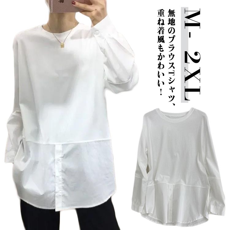 ブラウスシャツ 白 切り替え 重ね着 プルオーバー カジュアル シンプル 重ね着 トップス レイヤード シャツ プルオーバー 着回し シンプル 秋 冬 春 長袖シャツ