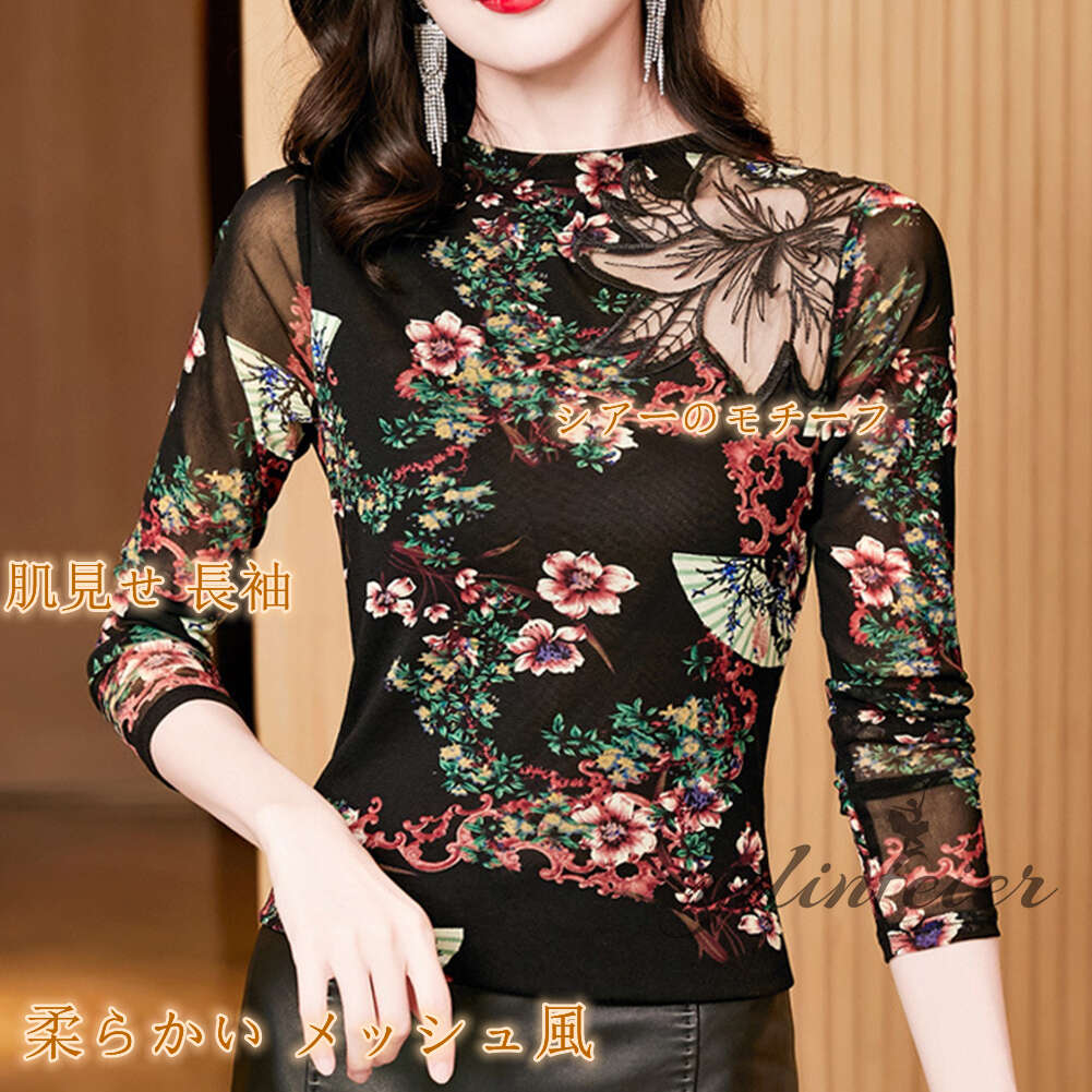 レディース トップス 花柄 シースルー インナー 日常着 通勤通学 社交ダンス モダンダンス ダンスTシャツ ダンスウェア レッスン着 カットソー タートルネック レ ハイネック