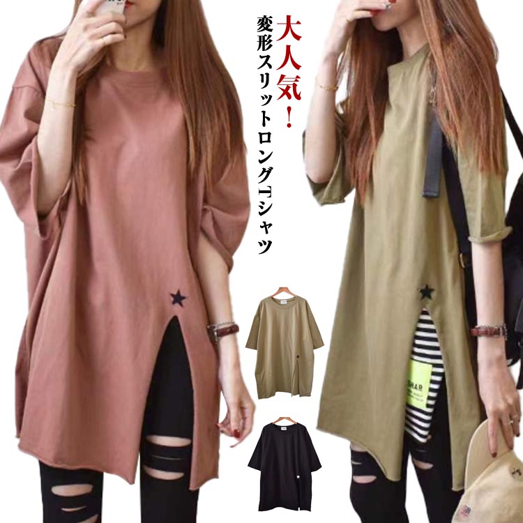 サイドスリット レディース ビッグt 五分袖 春夏 ゆったり ドロップショルダー ロングtシャツ おしゃれ 半袖ロンt ロンティー ティーシャツ トップス 女性用 ゆるtシャツ ビッグtシャツ レ 秋