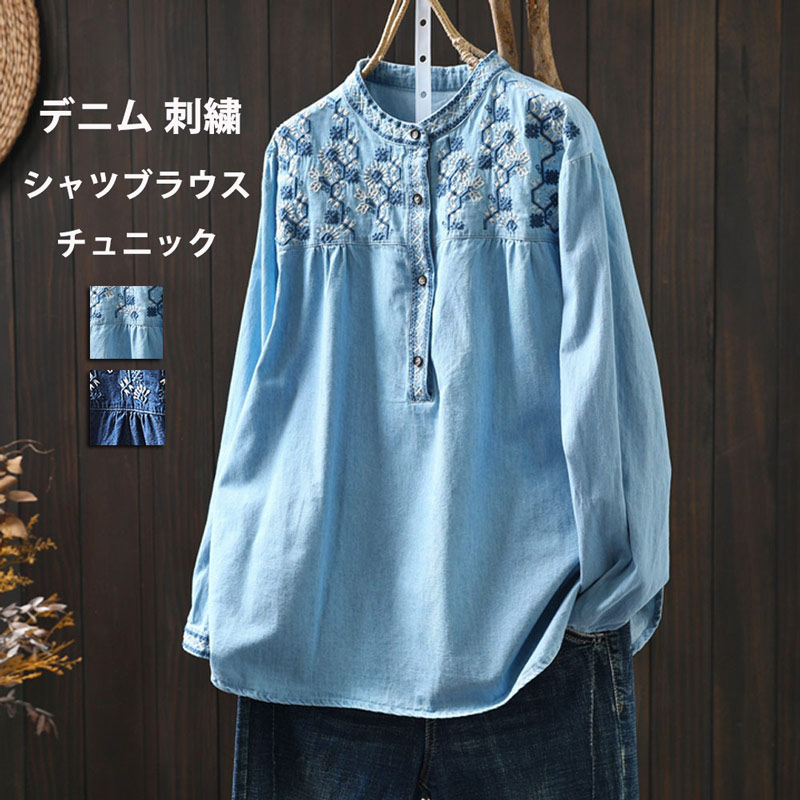デニムシャツ チュニック レディース デニムブラウス シャツ デニム ブラウス トップス 長袖 立ち襟 刺繍 プルオーバー 体型カバー ゆったり 長袖ブラウス 刺繍シャツ 花柄 ギャザー 大きい 無地
