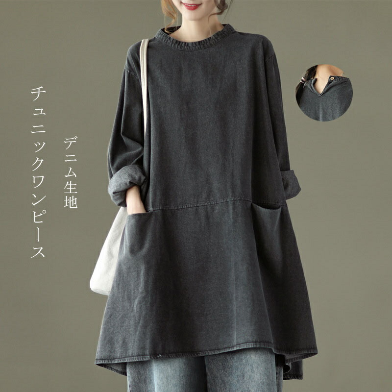 レトロ風チュニックワンピース デニム 体型カバー 美しいシルエット ロングシャツブラウス 前後差 20代 30代 40代トップス 春夏 秋 シンプル