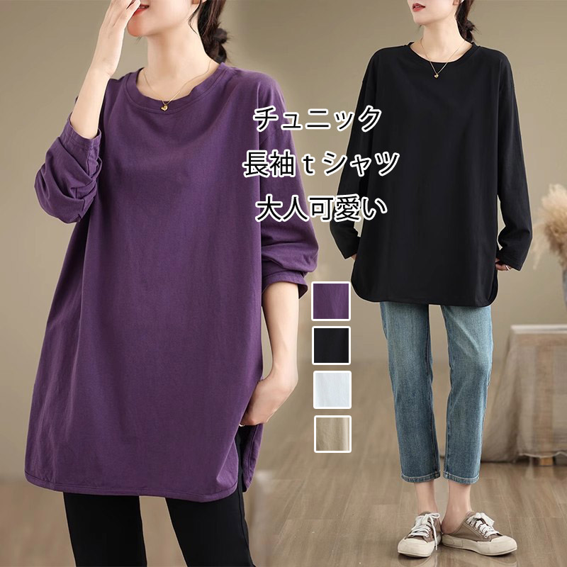 チュニック Tシャツ レディース ロンT ブラウス 長袖 スリット 丸首 無地tシャツ 春 秋 夏 トップス プルオーバー 長袖tシャツ ゆったり 無地 ロングtシャツ カジュアル カットソー 綿混