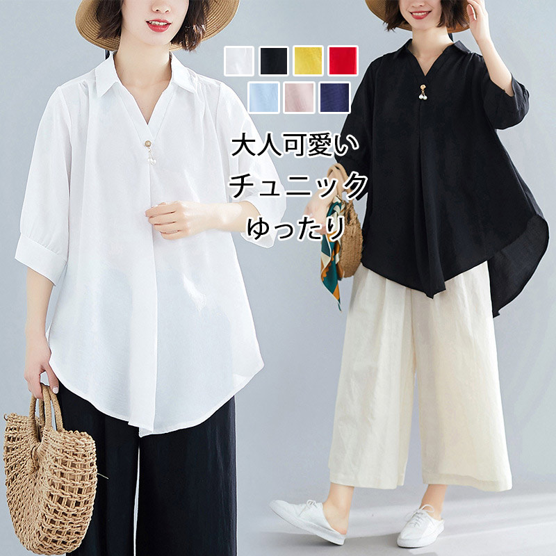 春夏人気再販 チュニック ブラウス 半袖 夏 シャツ 白 シャツブラウス レディース 大きいサイズ ギャザー フレアブラウス ロング ロングシャツ 半袖シャツ 五分袖 白シャツ v トップス