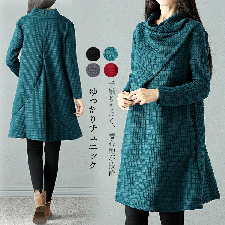 チュニック ワンピース 長袖 膝丈 チュニックワンピース 秋冬 ハイネック 膝丈ワンピース タートル フレア aライン フレアワンピース ポケット ひざ丈 不規則 体型カバー 大きいサイ プルオーバー