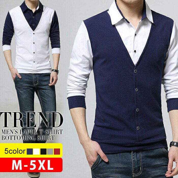 ポロシャツ メンズ 長袖 ロンT Tシャツメンズ カットソー フェイクレイヤード 襟付き 重ね着風 スタイリッシュ おしゃれ vネック