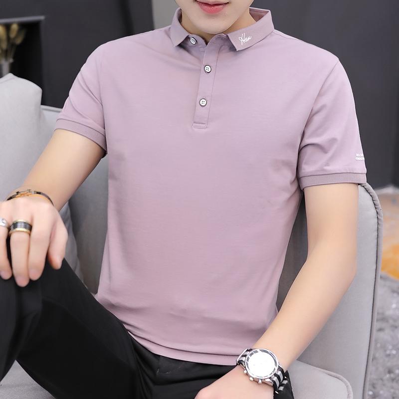 ポロシャツ メンズ 半袖 スタンドカラー 立ち襟 夏 カジュアル 無地 シンプル トップス コットン パープル ホワイト グリーン 刺繍