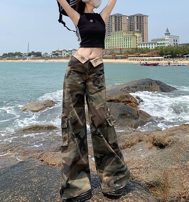 ウエスト折り 迷彩柄 カーゴパンツ レディース パンツ ボトムス ロングパンツ ワイドパンツ ロング ワイド ブーツカット ストリート ファスナー ポケット ハイウエスト ボタン