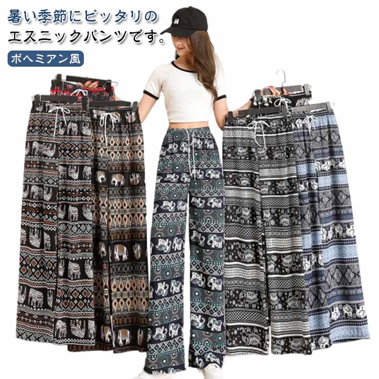 タイパンツ 総柄 エスニック ウエストゴム ゾウ柄 涼しい ヨガパンツ レディース 軽い 春夏 薄手 カジュアルパンツ ストレート ロングパンツ 部屋着 ルームウェア お洒落 アジアン