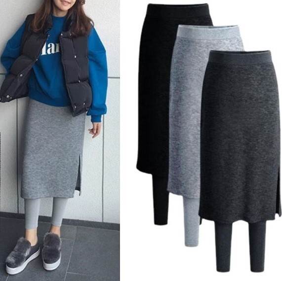 フェイクレイヤード レギンスドッキング ナロースカート レディース スカート ボトムス 膝丈 膝下 ミモレ 9分丈 ミディアム丈 Iライン ハイウエスト ウエストゴム 裏起毛 伸縮性 シンプル 厚手
