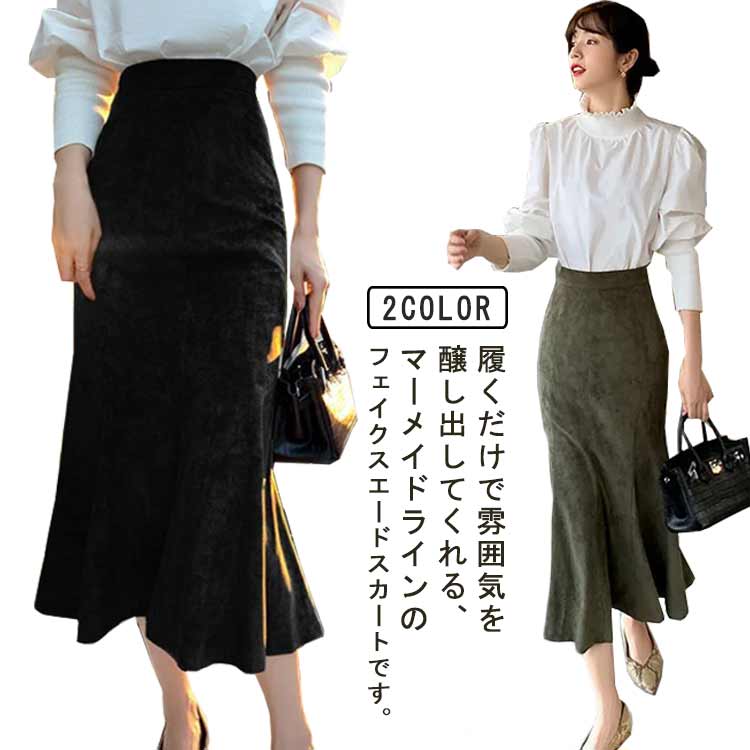 フレアスカート ロング マーメイドスカート ハイウエスト フェイクスエード スカート ロングスカート マーメイドライン 春夏 秋 黒 韓国 ミモレスカート きれいめ 大人 エレガント オフィ おしゃれ