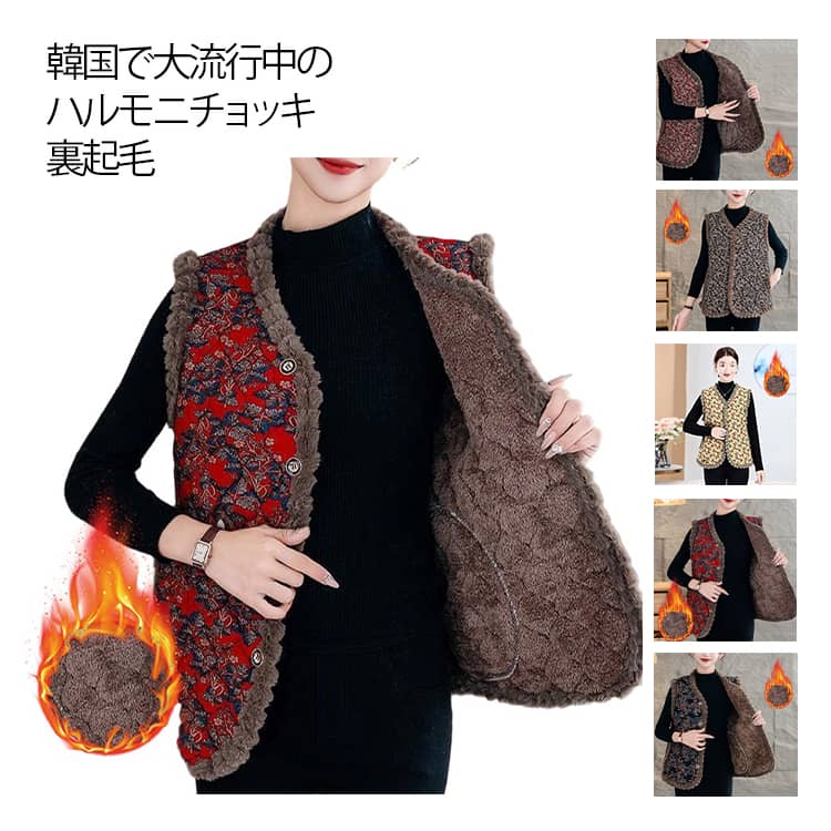 ハルモニチョッキ ファー 裏起毛 中綿入り ベスト ハルモニベスト 韓国 ハルモニ おばあちゃん シニアファッション 厚手 防寒 チョッキ ベスト 羽織り ルームウェア