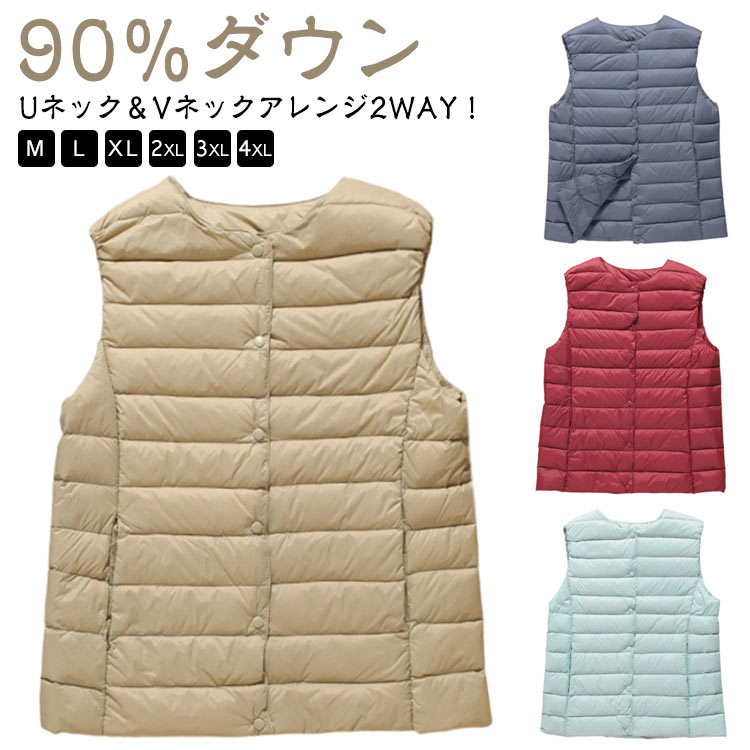 ダウンベスト レディース インナー 軽量 インナーベスト インナーダウンベスト 冬 撥水 90%ダウン 丸首 秋 暖かい 薄手 コンパクト クルーネック あったか 防寒 Vネック