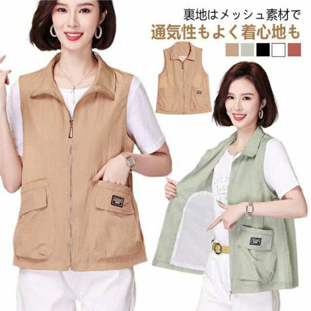 ベスト レディース スタンドカラー ジップアップ 前開きベスト ノースリーブ ジャケット 春夏 薄手 カジュアル ミリタリーベスト 裏メッシュ 大人 サマージャケット アウト ポケット付き