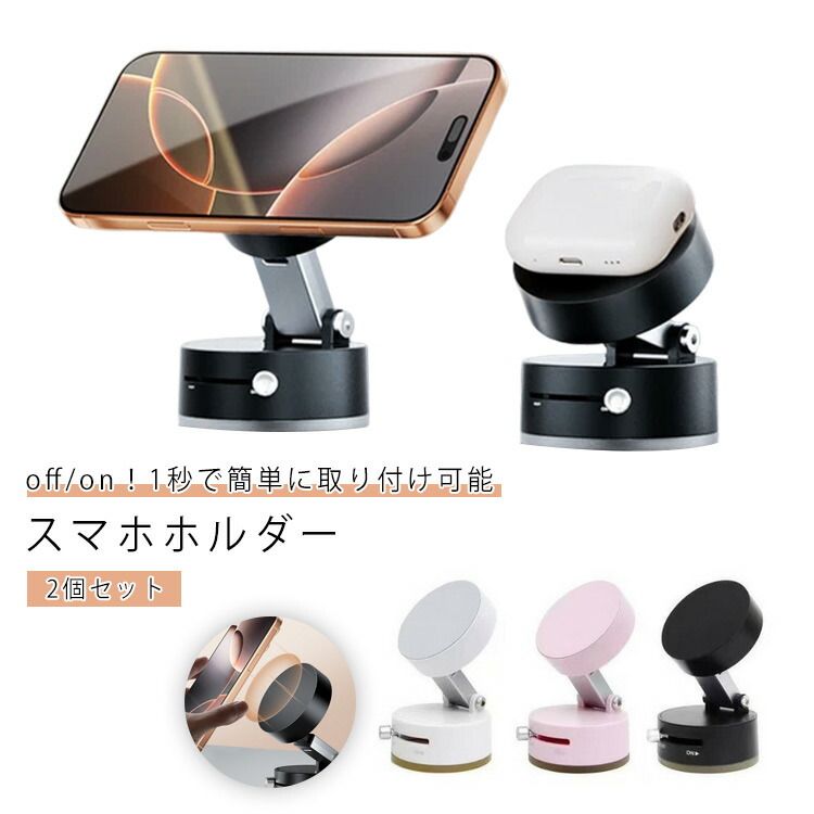 真空吸盤&磁気でしっかり固定!スマホホルダー 車 マグネット 2個セット 真空吸着 強力吸着 車載用 折りたたみ 伸縮 コンパクト キッチン