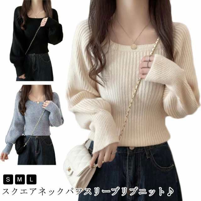 パフスリーブ リブニット レディース ニット ニットセーター ボリューム袖 ニットソー セーター 無地 袖ぽわん 長袖 Uネック スクエアネック 秋冬 トップス 春 冬 柔らか シンプル 秋
