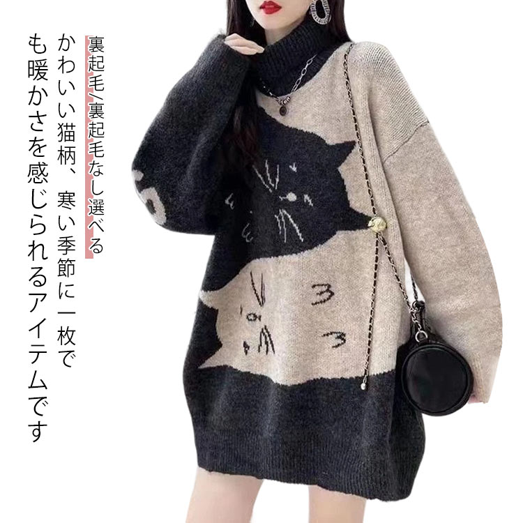猫柄 セーター プルオーバー レディース 猫 ニット ネコ柄 ハイネック ミドル トップス チュニック 秋冬 あったか ゆったり 大きめ ねこ ネコ キャット CAT おしゃれ ロング 裏起 かわいい