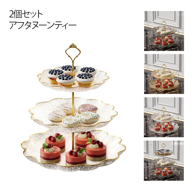 スタンド 3段 2セット 2段 おしゃれ フリル 焼き菓子 ゴールドライン かわいい ケーキスタンド デザートプレート プレートスタンド スイーツスタンド 半透明 高級 デザートスタンド 果 シンプル