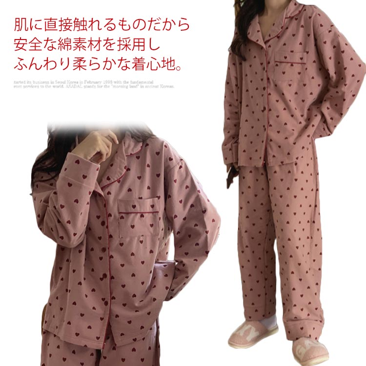 送料無料 パジャマ レディース ルームウェア 可愛い ハート柄 長袖 前開き ピンク