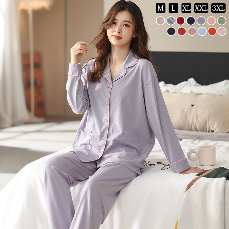 ルームウエア パジャマ レディース 綿100% コットン 長袖 長ズボン 春 夏 秋 上下セット 前開き 冷え性対策 暖かい 肌触りがいい 13color 柔らかい