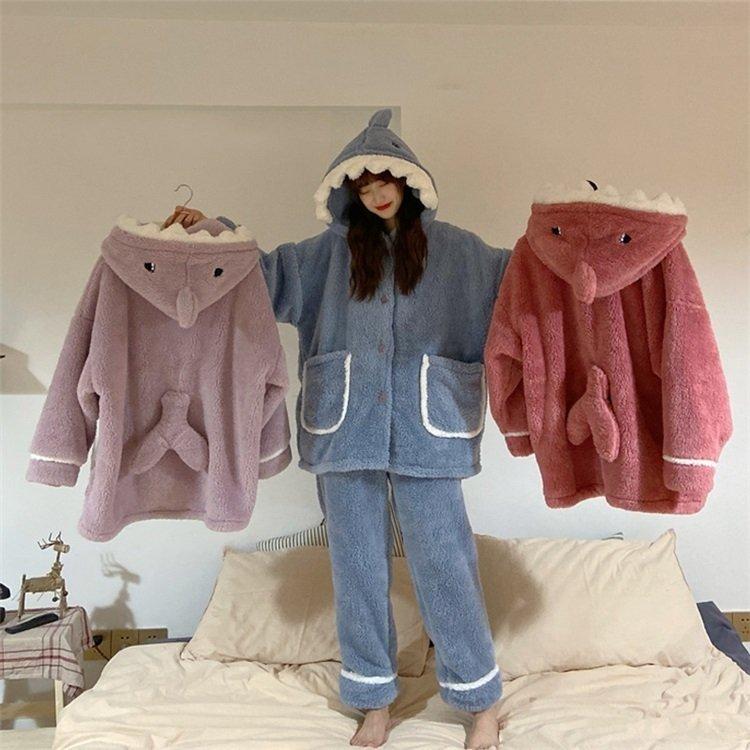 3色レディースふわもこ パジャマ ルームウェア 暖かい サメ柄 フード付き もこもこ防寒 ふわふわ部屋着 ナイトウェア 上下2点セット 冬物 可愛い 送料無料