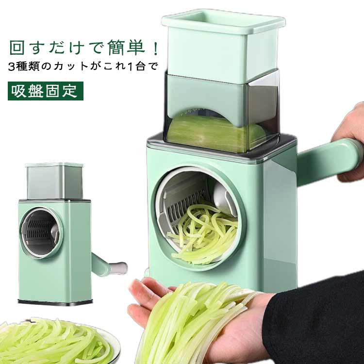 野菜スライサー 回転式 スライサー 千切り おろし 多機能 吸盤固定 広い投入口 お手軽 簡単調理 時短 キッチン便利グッズ 野菜カッター 万能スライサー 一台3役 キャベツスライサー フードカッター