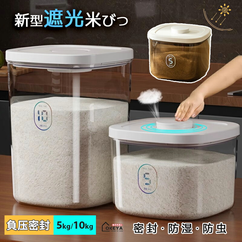 お米収納 遮光米びつ 米びつケース 真空保存容器 フードストッカー ボタン押しタイプ 計量カップ付 密閉米びつ 残量見える 負圧密封桶 省スペース キッチン収納容器 湿気防止