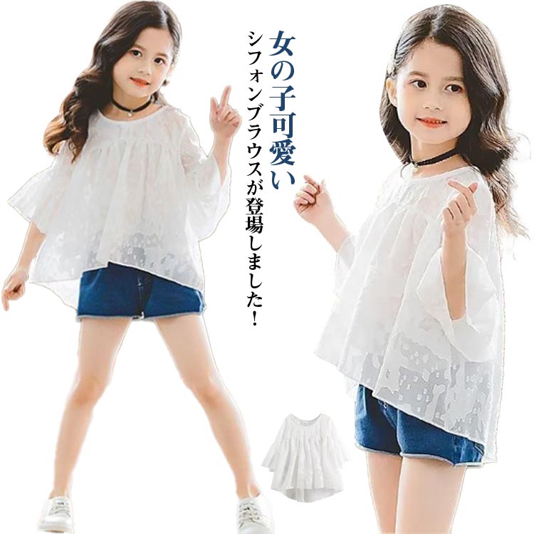 女の子 シフォンブラウス ブラウス キッズ レースブラウス 7分袖 透け感 可愛い フレア袖 子供服 ガールズ おしゃれブラウス トップス ジュニア 大きいサイズ おしゃれ シンプル 女 無地