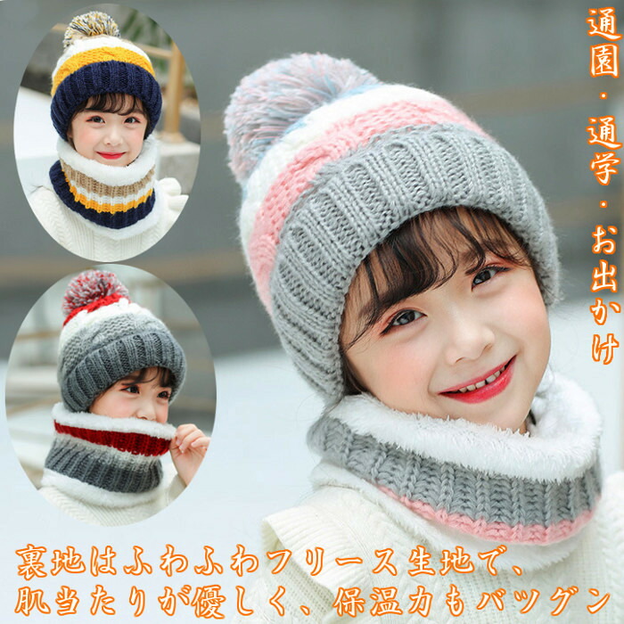 2点セット ニット帽 ネックウォーマー 裏ボア ポンポン付き 可愛い 暖かい帽子 キッズ スキー 子ども帽子 冬用