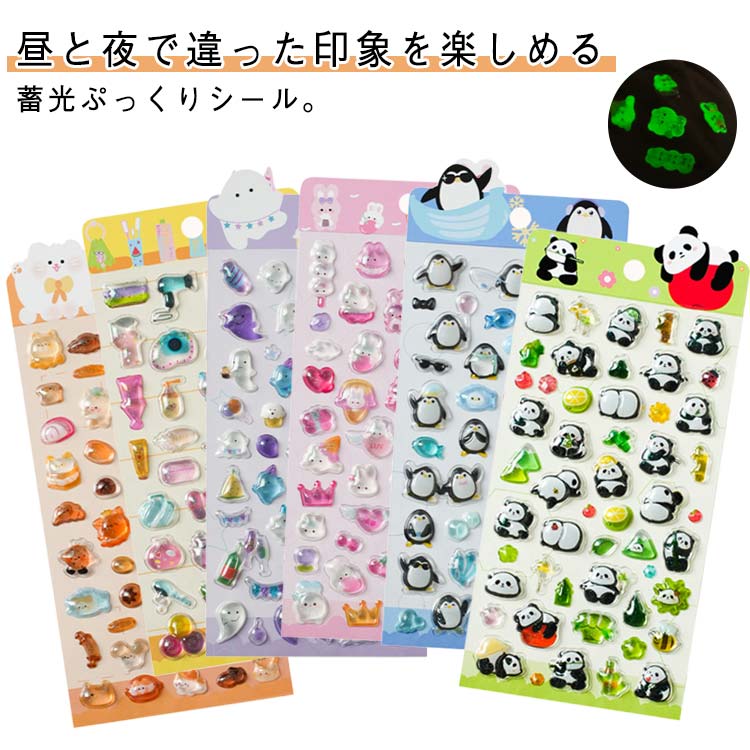 蓄光ぷっくり キラキラ うるつやシール 光るシール ぷくぷく ぷっくりシール 透明感 かわいい キャラクター ねこ 猫 うさぎ パンダ つやつや 光沢 推し活 3D 立体ステッカー ぷくぷ 暗闇で光る