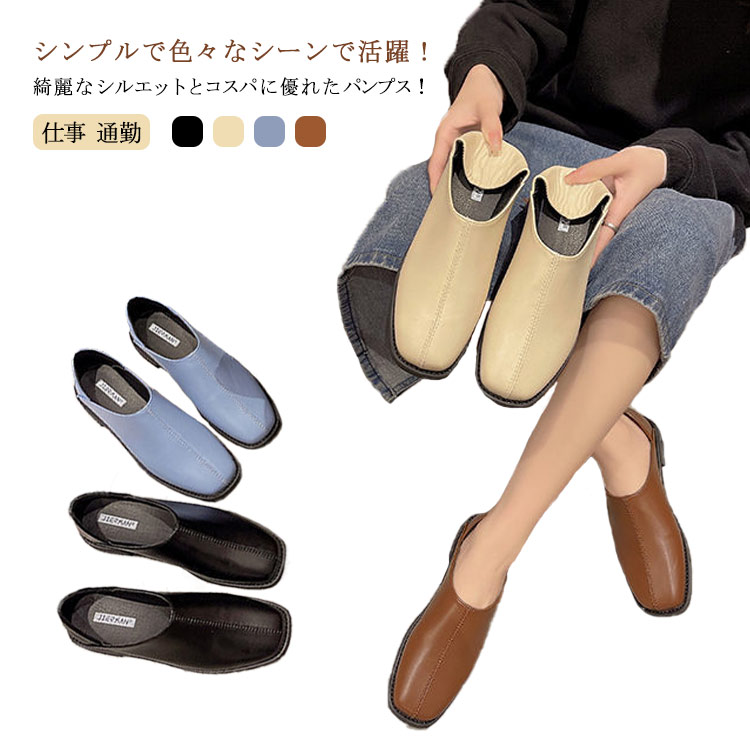 シューズ 痛くない ぺたんこ 外履き かかとが踏めて楽ちん スクエア フラットシューズ 走れる 幅広 スリッポン 靴 パンプス つっかけ 歩きやすい 仕事 通勤 オフィスカジュアル 疲れない