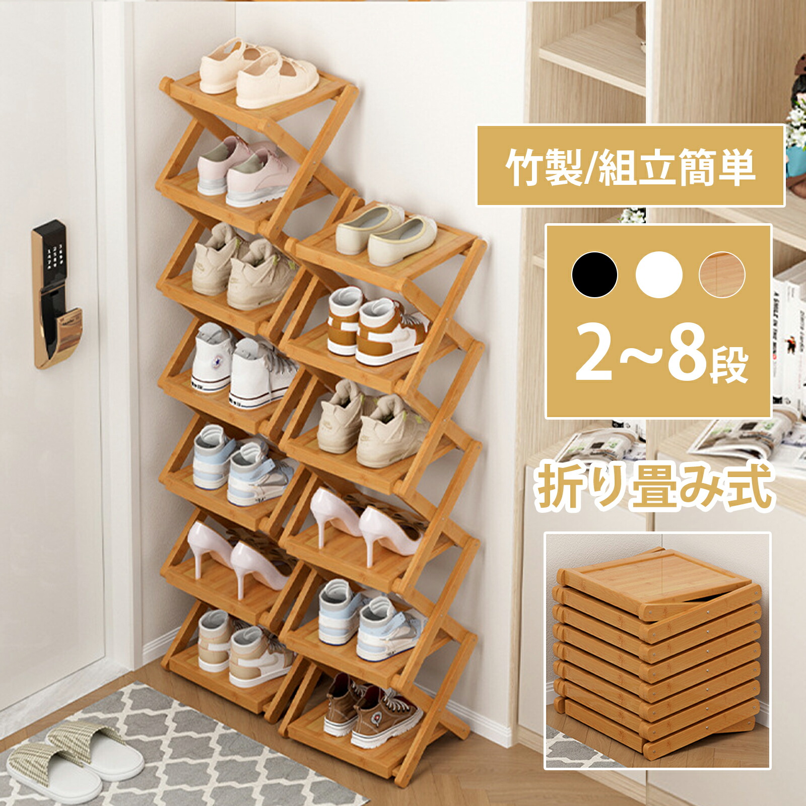 シューズラック スリム 組立不要 靴箱 靴棚 下駄箱 靴 収納 シューズボックス 完成品 玄関収納 下足箱 折畳式 省 スペース ラック 竹製 コンパクト 8段 シューズ収納 玄関家具 大容 伸縮
