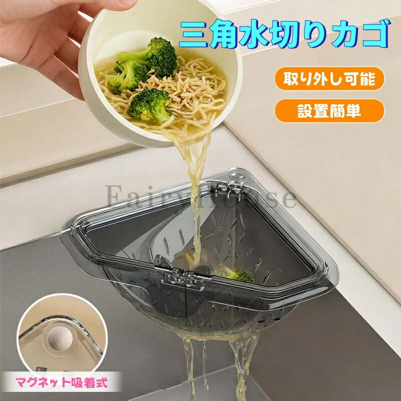三角水切りカゴマグネット固定式 三角コーナー 水切りラック シンクサイド収納ラック 防臭メッシュ付き 調理後片付け簡単 省設計 水切りバスケット 現代モダン風 取り外し簡単 コンパクト設 分解洗浄可能