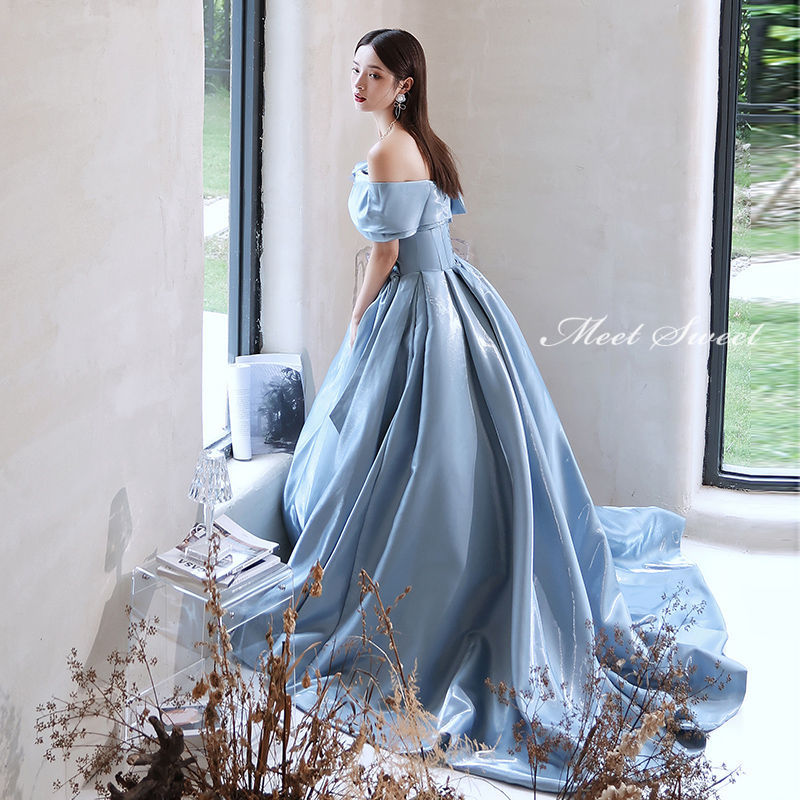 ウエディングドレス カラードレス ロングドレス 演奏会 イブニングドレス ブルー オフショルダー サテン パーティードレス トレーン プリンセス ウェディングドレス 二次会ドレス 花嫁 発表会 結婚式