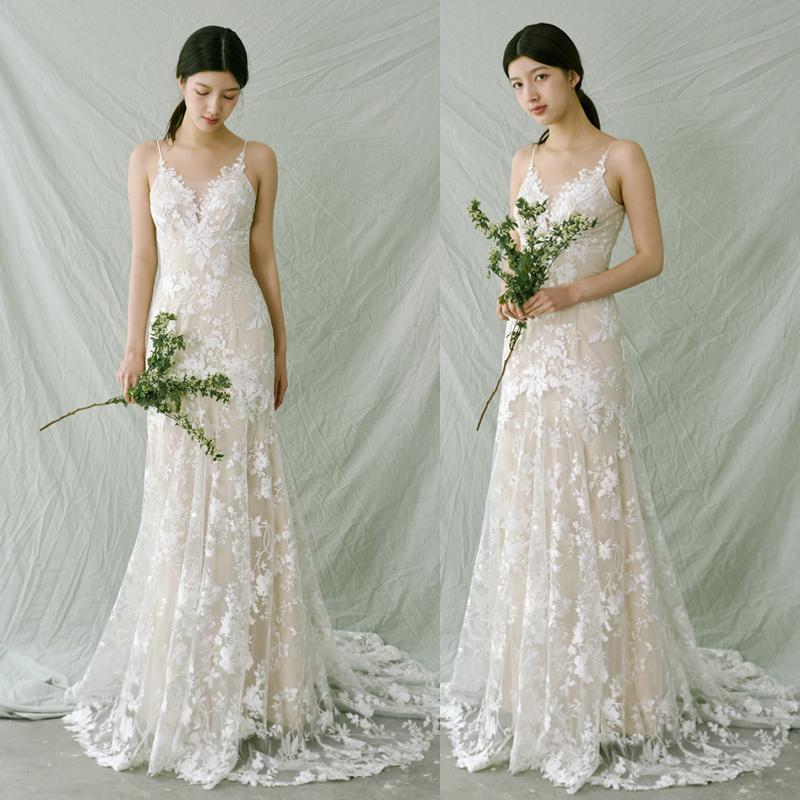 ウェディングドレス ウエディングドレス 二次会 結婚式 前撮り ブライダル ロングドレス 花嫁 スレンダードレス シャンパンベージュ 総レース 袖なし 海外挙式 フォトウェディング キャミ バッグレス