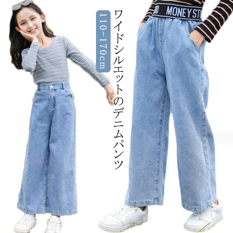 キッズ デニムパンツ ガールズ ワイドパンツ ボトムス 子供服 ロングパンツ 女の子 女児 小学生 春 ジュニア 薄手 通学 ジーパン カジュアル