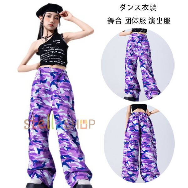 紫 迷彩パンツ キッズダンスパンツ 女の子 紫 カーゴパンツ ストリートダンス 舞台 団体服 演出服 パープル ワイドパンツ ジャズダンス 運動会、応援団、クラス活動 チアガール 練習着