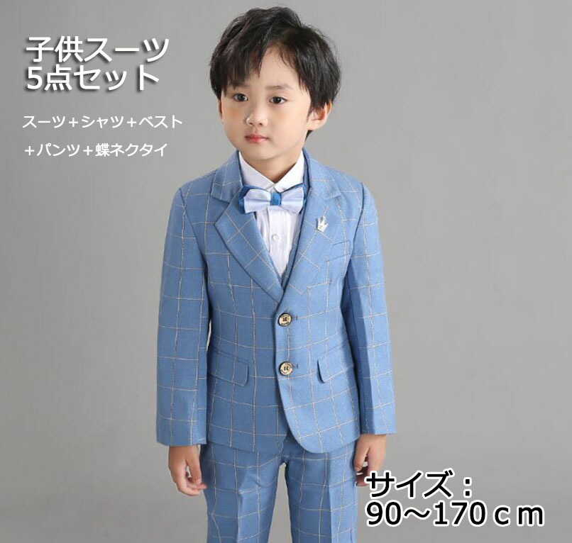 カッコイイ 品質良い ブルー チェック 子供服 スーツセット ジャケット+パンツ+ベスト+シャツ+蝶ネクタイ 七五三 小学校 入園式 入学式 卒業式 結婚式 写真撮り 音楽会 オシャレ フォ 演奏会