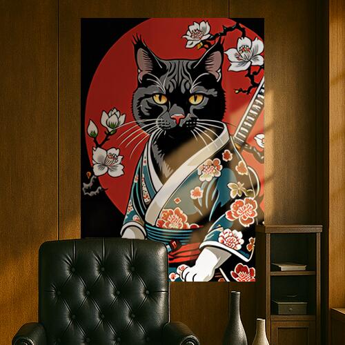 猫 侍 着物 桜 武士道 タペストリー 和モダン 和柄 浮世絵風 刺青風 昭和レトロ 壁掛け 大判 長方形 タトゥー ジャパニーズ 男気 アウトロー 黒 赤 白 壁布