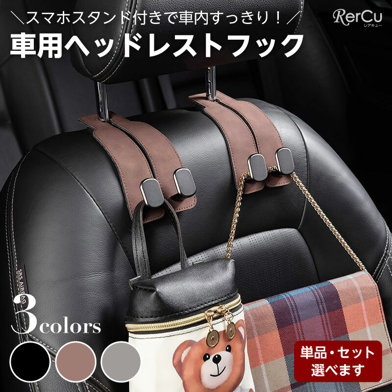 携帯ホルダー スマホホルダー 車 後部座席 フック かける 傘かけ 高級スエード調マイクロファイバー使用 車用ヘッドレスト スマホスタンド付き コンパクト設計 PU合皮 ダブルフック